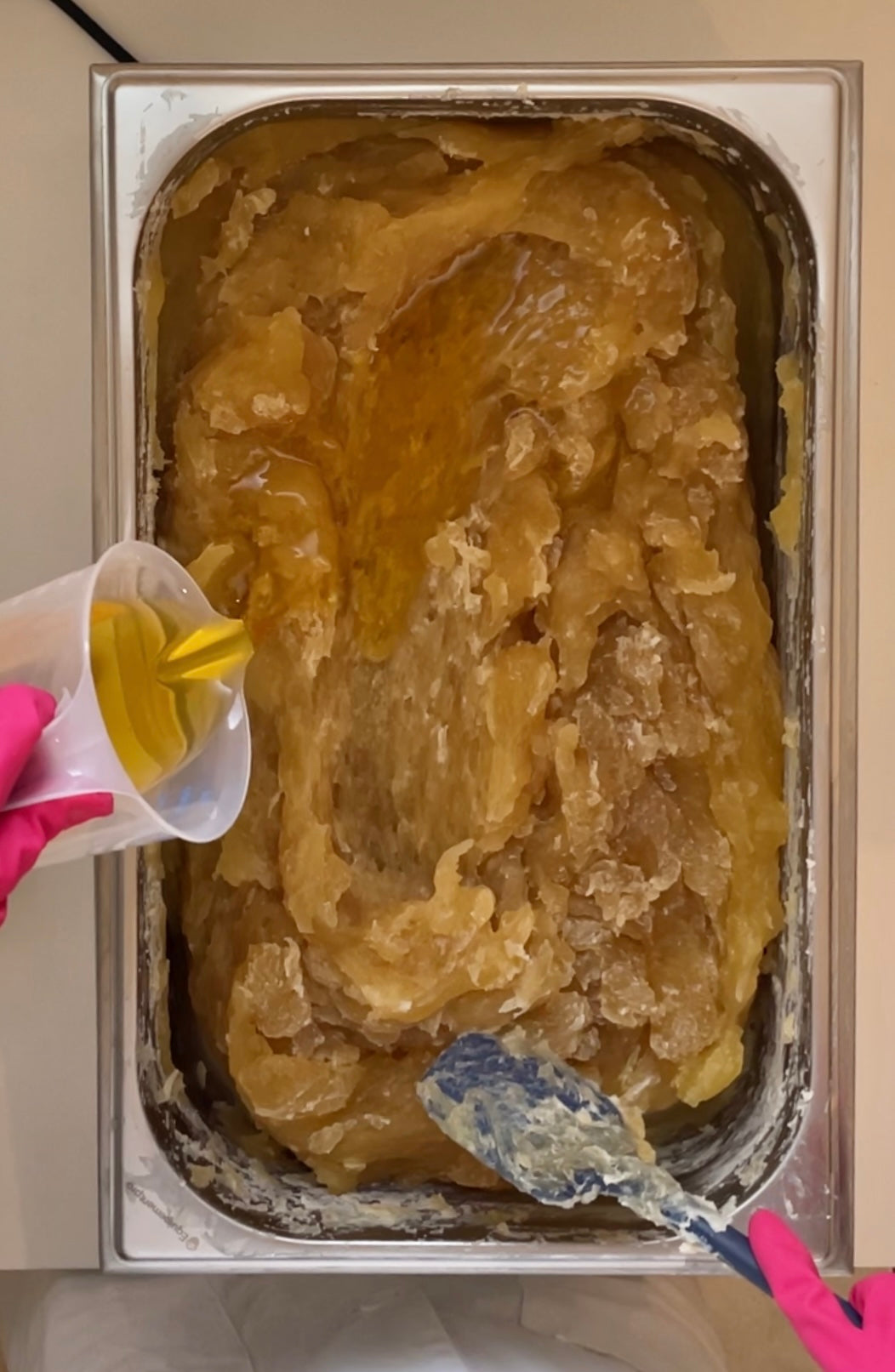 Il s'agit d'une méthode de saponification qui me permet de m'assurer que les huiles utilisées pour constituer le surgras de mon savon ne seront pas altérées par la base caustique de la préparation. En effet, en saponification au chaudron, les ajouts d'huiles nobles et autres ingrédients bienfaisants peuvent se faire après que la saponification ait eu lieu.