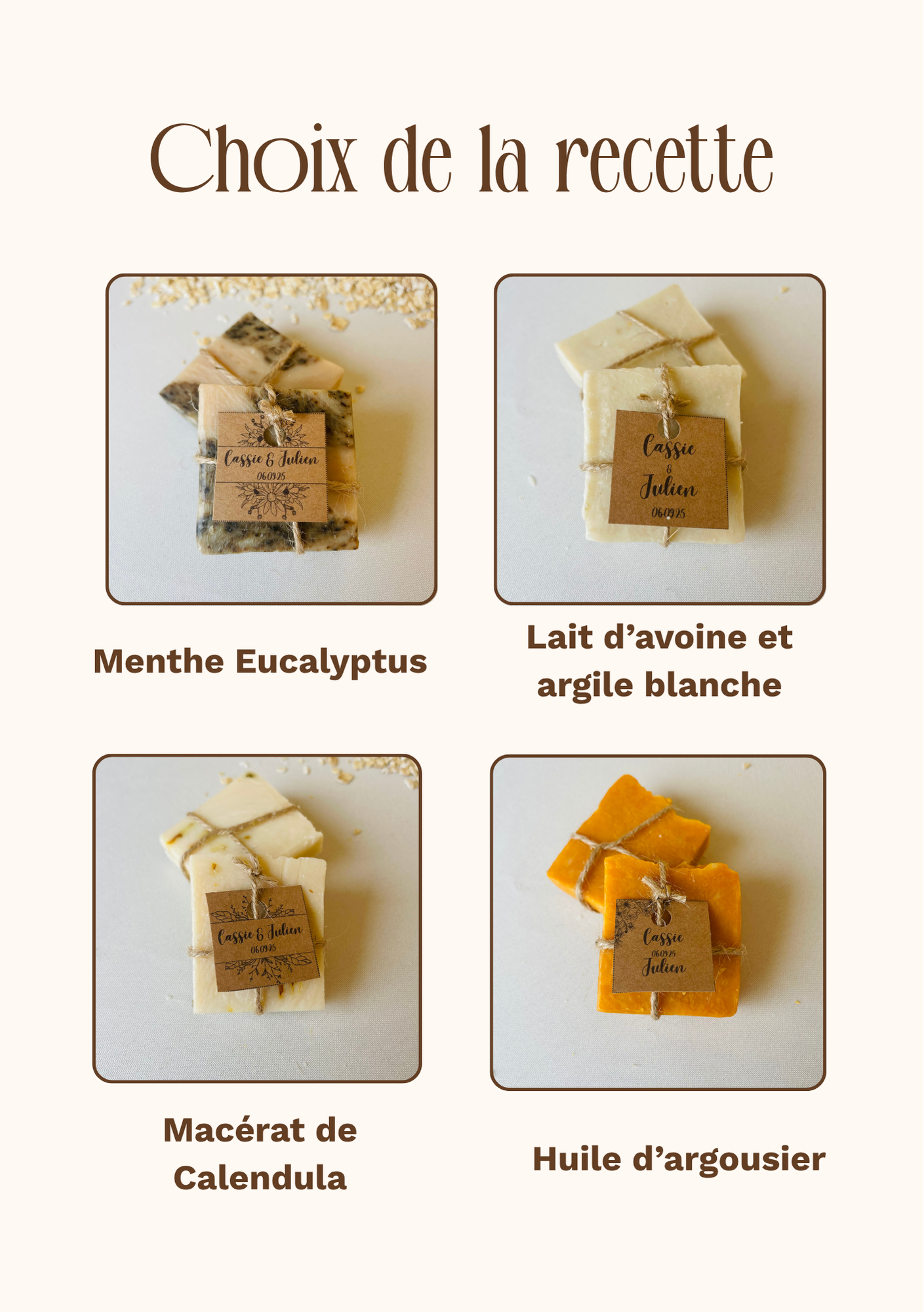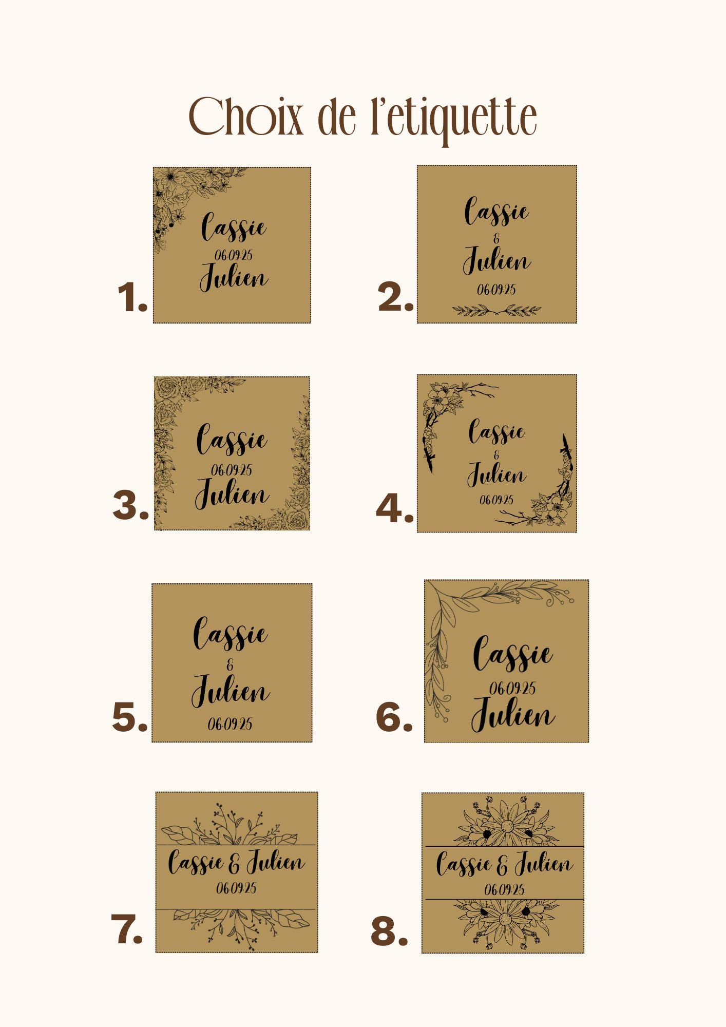 Choisissez parmi les recettes existantes, précisez moi le texte ou les prénoms à indiquer sur l'étiquette, et son design.